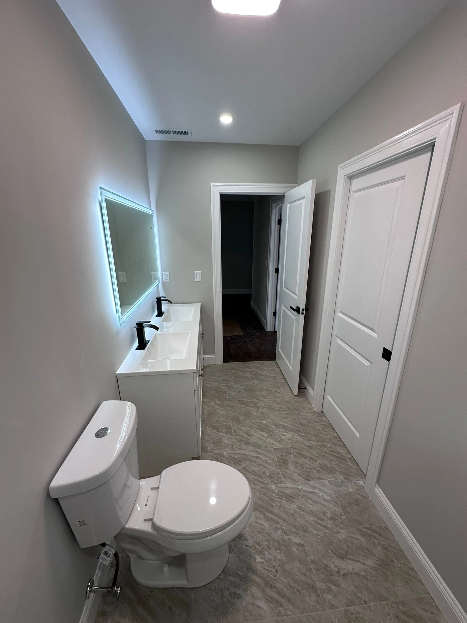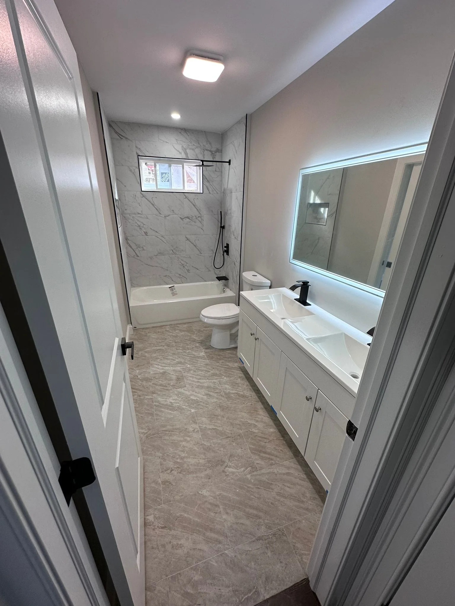This project updated the existing bathroom to achieve a modern aesthetic. First, the team prepared the space for entirely new fixtures. Then, large-format grey marble-look tiles covered the main floor. These tiles transition into marble-style subway tiling within the shower alcove. Furthermore, a sleek white double vanity serves as the central feature. It pairs with a backlit mirror and matte black faucets. Finally, the full bathroom remodel includes a new toilet and fresh paint. Uniform black hardware on the doors ensures a cohesive design throughout the room.