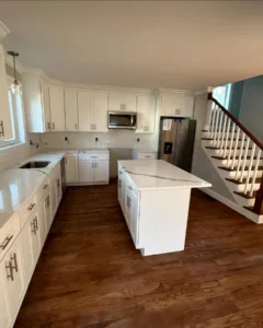 - Replacing old cabinetry with white modern units.