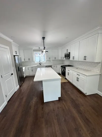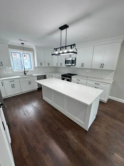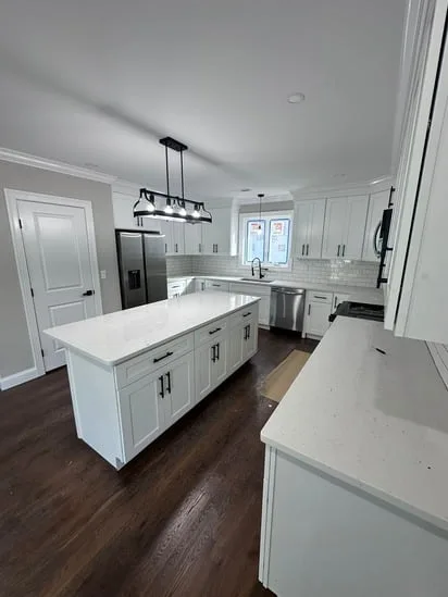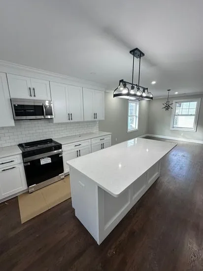 This project involved a full kitchen renovation with custom cabinetry, focusing on improved layout, functionality, and visual consistency. Additionally, the work incorporated seamless transitions between cabinetry, countertops, and flooring, while also enhancing lighting distribution and appliance integration. As a result, the finished space reflects a cohesive, modern kitchen designed for daily use and long-term durability.