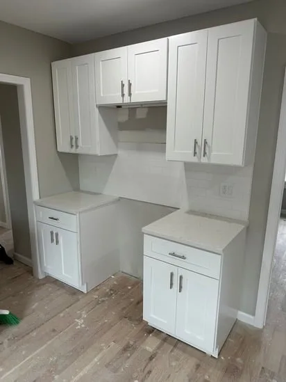 This project involved the installation of white shaker cabinets, bringing a fresh and contemporary look to the kitchen. The cabinets were designed to fit perfectly into the space, offering both aesthetic appeal and practical storage solutions. Following the installation, the kitchen was transformed with a clean, minimalist design that seamlessly blends into the surrounding décor. Additionally, the countertops were installed to complement the sleek style of the white shaker cabinets, offering an elegant and functional surface.